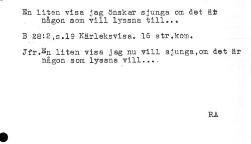 //// En liten visa jag önskar sjunga om det ät //// någon som vill lyssna till... //// * //// B 28:2,s.19 Kärleksvisa. 16 str.kom. //// * //// Jfr.-^n liten visa jag nu vill sjunga,om det är //// någon som lyssna vill.... ////