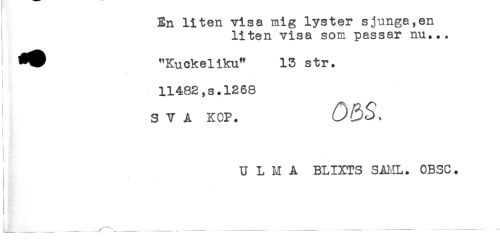//// En liten visa mig lyster sjunga,en //// liten visa som passar nu... //// "Kuckeliku" 13 str. //// 11482,s.1268 //// SVA KOP. //// i //// U L M A BLIXTS SAML. OBSC. ////