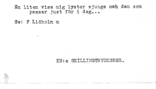 //// En liten visa mig lyster sjunga och den som //// passar just för i dag... //// Se: F Lidholm m //// KB:s SKILLINGTRYCKSREG. ////