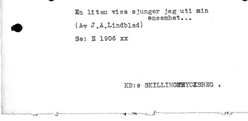 //// En liten visa sjunger jag uti min //// ensamhet... //// ^ (Av J.A.Lindblad) //// ^ Se: E 1906 xx //// . //// i //// KB:s SKILLINGTRYCKSREG . //// * //// 3' //// t //// [---;----'----- ////