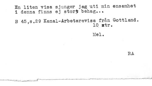 //// En liten visa sjunger jag uti min ensamhet //// i denna finns ej storj? behag..* //// B 45,s.29 Kanal-Arbetarevisa från Gottland. //// 10 str. //// * //// Mel. //// RA //// //// /