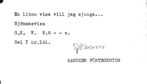 //// En liten visa vill jag sjunga... //// i //// Sjömansvisa //// ' . j //// G.K. W. 5.6--s. //// Del I nr.141. , //// RANCKEN FÖRTECKNING ////