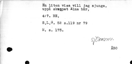 //// En liten visa vill jag sjunga, //// uppå skaRpet Alma här, //// 4:7. RE. //// S.L.S. 52 s.119 nr 79 //// N. s. 175. //// } , ////