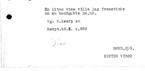 //// En liten vise ville jag framsticke //// ^ om en bondgubbe hm,hm, //// j Vg. N.Asarp sn //// i //// I Hskpt.bd.8. s.689 //// - //// j ^ //// NORD.MUS. //// KOPIOR VISOR //// ___ _____^.....\- -- - ......' --- --- --- --- ////