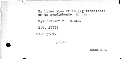 //// En liten visa ville jag framsticka //// om en gyndisbonde, hu hm... //// Mskpt.Visor VI. s.363. //// E.U. 23338 //// Utan prov. //// J ^^ //// NORD.MUS. ////