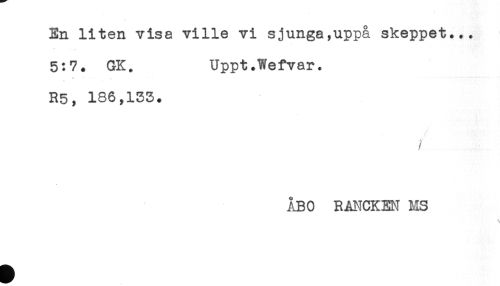 //// En liten visa ville vi sjunga,uppå skeppet... //// 5:7. GK. Uppt.Wefvar. //// ^ * ^ //// R5, 186,133. //// //// /ÅBO RANCKEN MS ////