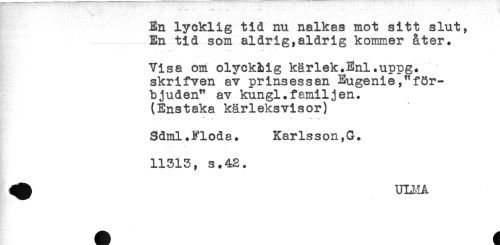 //// En lycklig tid nu nalkas mot sitt slut. //// En tid som aldrig,aldrig kommer åter. //// - . . .. . - //// Visa om olyckMg kärlek.Enl.uppg. //// skrifven av prinsessan Eugenie,"för- //// bjuden" av kungl.familjen. //// (Enstaka kärleksvisor) //// .. * < - - ^ //// Sdml.Flöda. Karlsson,G. //// 11313, s.42. //// ^ ULMÅ ////