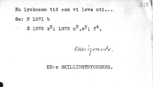 //// 11! 1 //// En lyckosam tid som vi leva uti... //// 3e: N 1871 b ! //// E 1872 x^; 1873 f^, //// . //// - -1 //// KB:s SKILLINGTRYCKSREG. //// < //// ) //// ) ////
