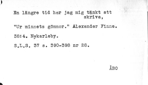 //// En längre tid har jag mig tänkt att //// skriva, //// "Ur minnets gömmor." Alexander Finne. //// 3814. Nykarleby. //// S.L.S. 37 s. 390-398 nr 28. //// i //// ) //// ÅBO ////