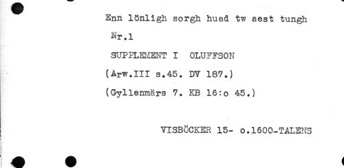 //// Enn ISnligh sorgh huad tw aest tungh //// Nr.l //// SUPPLEMENT I OLUFFSON //// (Arw.III s.45. DV 187.) //// (Gyllenmärs 7. KB 16:o 45.) //// ' <? //// -- //// VISBÖCKER 15- O.1600-TALENS //// ! ////
