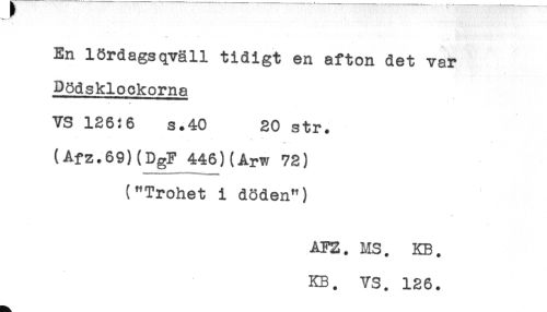 //// En lördagsqväll tidigt en afton det var //// Dödsklockorna //// * * //// VS 126:6 S.40 20 str. //// (Afz.69)(DgF 446)(Arw 72) //// ("Trohet i döden") //// AFZ. MS. KB. //// KB. VS. 126. ////