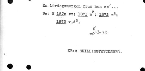 //// En lördagsmorgon frun hon sa'... //// Ti ^ //// Se: E 187o zz; 1871 o^; 1872 z^; //// 1875 v,d3, //// ! //// KB:s SKILLINGTRYCKSREG. ////