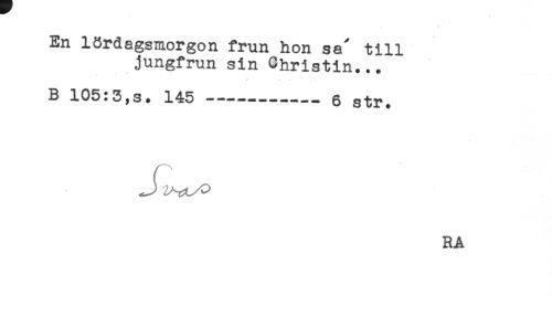 //// En lördagsmorgon frun hon sa' till //// jungfrun sin Christin... //// ' . . //// B 105:3,s. 145-----6 str. //// RA ////