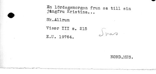 //// En lördagsmorgon frun sa till sin //// ^ jdngfru Kristina... //// Sk.Allrum //// Visor III s. 215 //// E.U. 19764. ^ //// NORD.MUS. ////
