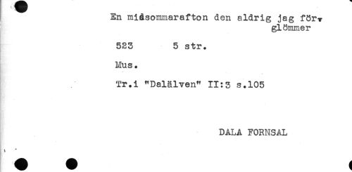 //// En midsommarafton den aldrig jag för* //// glömmer //// * //// 523 5 str. //// Mus. //// v //// * //// Tr.i "Dalälven" 11:3 s.105 //// - //// DALA FORNSAL //// - //// t * ////