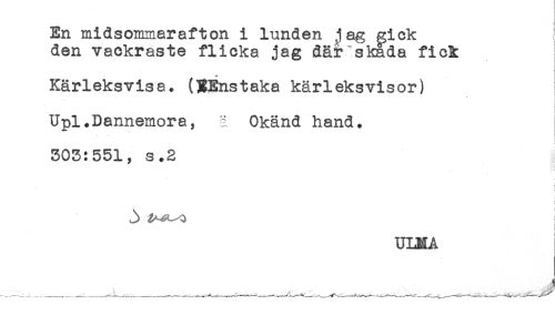 //// En midsommarafton i lunden jag gick //// den vackraste flicka jag där skada fick //// Kärleksvisa. (HEnstaka kärleksvisor) //// Upl.Dannemora, å Okänd hand. //// * //// 303:551, s.2 //// : //// } //// i //// ULNA //// __ ___, ... ^ ...... ...... ////