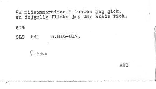 //// En midsommarafton i lunden gag gick, //// en dejgelig flicka jag där skada fick. //// * //// SLS 541 s.816-817. //// ÅBO ////