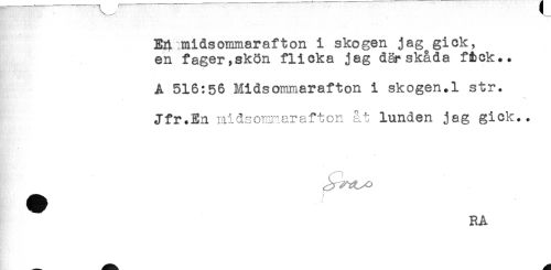 //// '-* - //// EA midsommarafton i skogen jag gick, //// en fager,skön flicka jag där skada fick.. //// A 516:56 Midsommarafton i skogen.1 str. //// Jfr.En midsommarafton åt lunden jag gick.. //// RÅ ////