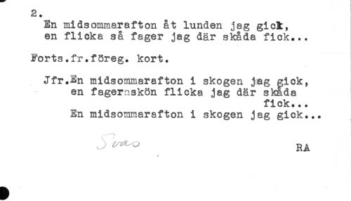 //// 2. //// En midsommarafton åt lunden jag gick, //// en flicka så fager jag där skåda fick... //// Forts.fr.fSreg. kort. //// Jfr.En midsommarafton i skogen jag gick, //// en fagernskön flicka jag där skada //// fick... //// En midsommarafton i skogen jag gick... //// -) ! //// . ^ ^^ RA ////