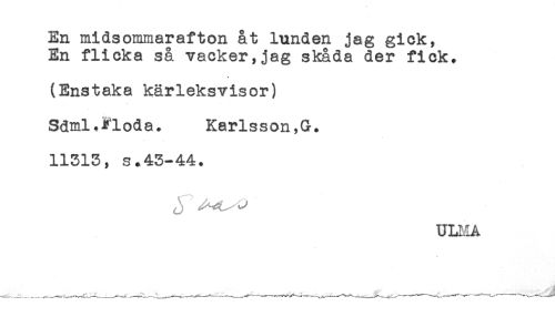 //// En midsommarafton åt lunden jag gick, //// En flicka så vacker,jag skåda der fick. //// * //// (Enstaka kärleksvisor) //// Sdml.Flöda. Karlsson,G. //// 11313, s.43-44. //// ULMA //// * ////