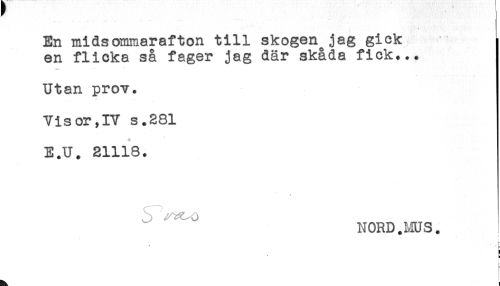 //// En midsommarafton till skogenjag gick //// en flicka så fager jag där skåda fick... //// ****** ;; //// Utan prov. //// * ! //// Vis or,IV s.281 //// E.U. 21118. //// //// /b ^^ //// NORDJvIUS. //// i //// t //// [ ////