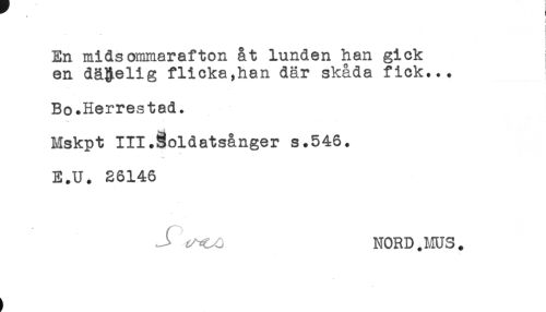 //// < //// t //// En midsommarafton åt lunden han gick //// en dä&elig flicka,han där skåda fick... //// Bo.Herrestad. //// Mskpt III.§oldatsånger s.546. //// E.U. 26146 //// NORD.MUS. ////