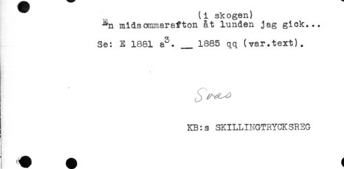 //// (i skogen) //// ^n midsommarafton åt lunden jag gick... //// Se: E 1881 a^. _ 1885 qq (var.text). //// KB:s SKILLINGTRYCKSREG ////
