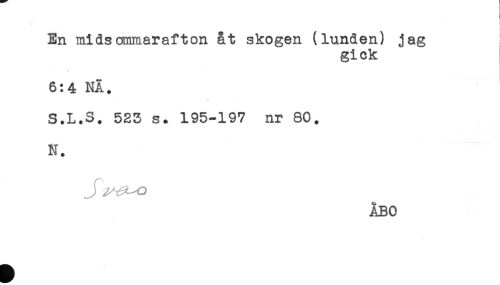 //// ) //// En midsommarafton åt skogen (lunden) jag //// gick //// * //// 6:4 NÅ. //// S.L.3. 523 s. 195-197 nr 80. //// N. //// ÅBO ////