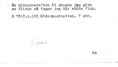 //// n En midsommarafton at skogen jag gick //// en flicka s& fager jag där skåda fick. //// B 73:3,s.103 Midsommarnatten. 7 str. //// RA ////