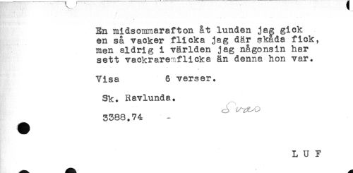 //// * //// En midsommarafton åt lunden ja^ gick //// en så vacker flicka jag där skada fick, //// men aldrig i världen jag någonsin har //// sett vackraremflicka än denna hon var. //// Visa 6 verser. //// Sk. Ravlunda. //// ^ 3388.74 //// L U F ////