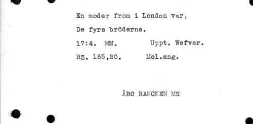 //// En moder from i London var, //// De fyra bröderna. //// * //// 17:4. MM. Uppt. Wefvar. //// . //// R3, 165,20. Mel.ang. //// ÅBO RANCKEN MS ////