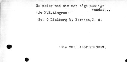 //// En moder med sin man sågs husligt //// vandra... //// (Av N.E.Almgren) //// : //// Se: 0 Lindberg b; Persson,C. d. //// ! //// i //// < //// I //// i //// ^ KB:s SKILLINGTRYCKSREG. ////