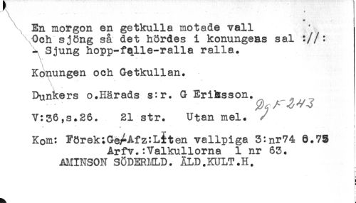 //// \ En morgon en getkulla motade vall ' //// Och sjöng så det hördes i konungens sal ://: //// - Sjung hopp-fqlle-ralla ralla. //// \ //// Konungen och Getkullan. //// < //// Dunkers o.Härads s:r. G Eriksson. //// V:56,s.26. 21 str. Utan mel. //// < //// Kom: Förek:Ge^Afz:Liten vallpiga 3:nr74 8.75 //// Arfv.:Valkullorna 1 nr 63. //// AMINSON SÖDERMLD. ÄLD.KULT.H. //// } //// 4 ////