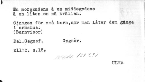 //// En morgondans å en middagsdans //// å en liten en mä kvällan. //// Sjunges för små barn,när man låter dem g&nga I //// i armarna. //// (Barnvisor) //// Dal.Gagnef. Gagnér. //// v //// 211:3. s.l5-y ' //// ^ ^ //// ULI.IA //// ! //// ! ////