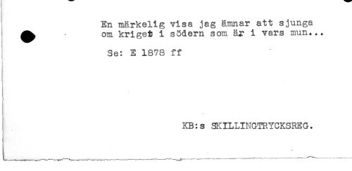 //// En märkelig visa jag ämnar att sjunga //// ^^ om kriget i södern som är i vars mun... //// Se: E 1878 ff //// ! //// KB:s SKILLINGTRYCKSREG. ////