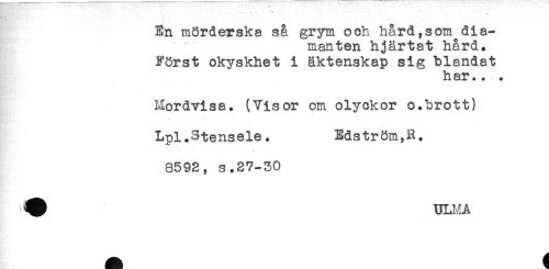 //// En mörderska så grym och hård,som dia- //// .......manten hjärtat hård. //// Först okyskhet i äktenskap sig blandat //// har.. . //// Mordvisa. (Visor om olyckor o.brott) //// . * "t* //// Lpl.Stensele. Edström,R. //// 8592, s.27-30 //// ^ ULMA ////