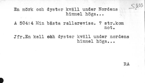//// En mörk och dyster kväll under Nordens ^ //// himmel höga... //// A 504:4 Min bästa rallarevisa. 7 str.kom //// not. //// Jfr.En kall ohh dyster kväll under nordens //// himmel höga... //// * //// RA //// * < ////