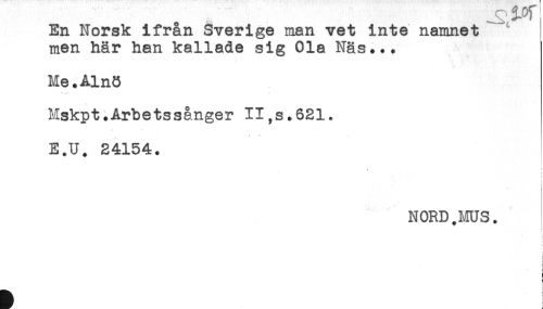 //// En Norsk ifrån Sverige man vet inte namnet //// men här han kallade sig Ola Näs... //// Me.Alnö //// Mskpt.Arbetssånger II,s.621. //// S ! //// E.U. 24154. //// t //// < < //// f //// NORD .ms. ////