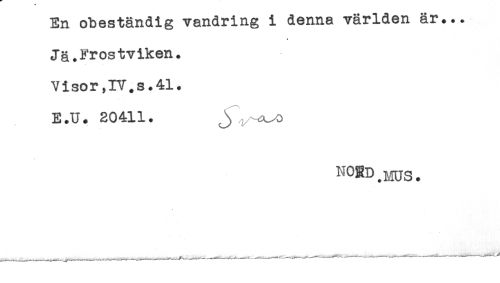 //// En obeständig vandring i denna världen ar... //// * //// Jä.Frostviken. //// Visor,IV.s.41. //// E.U. 20411. j ^o //// NORD.Mus. ////