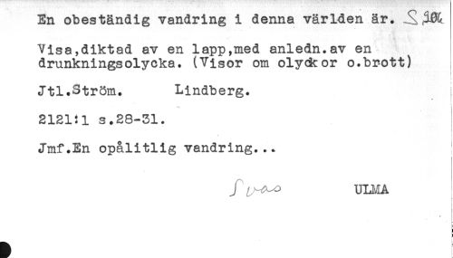 //// En obeständig vandring i denna världen är. //// Visa,diktad av en lapp,med anledn.av en //// drunkningsolycka. (Visor om olydcor o.brott) //// < //// Jtl.Ström. Lindberg. //// * //// t //// S12i:i s.28-31. //// Jmf.En opålitlig vandring... //// / ULI-ÅA //// ^ t ////