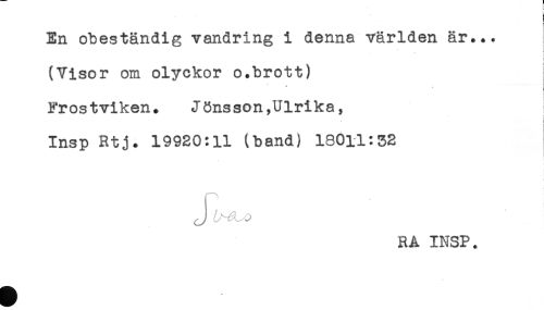 //// ! //// r //// En obeständig vandring i denna världen är... //// (Visor om olyckor o.brott) //// * //// Frostviken. Jönsson,Ulrika, //// Insp Rtj. 19920:11 (band) 18011:32 //// RA INSP. ////