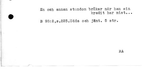 //// En och annan stundom bråkar när han sin //// kredit har mist... //// B 98:2,s.225.Udda och jämt. 5 str. //// RA //// L-...r* .... ... - -- . --- --- ////