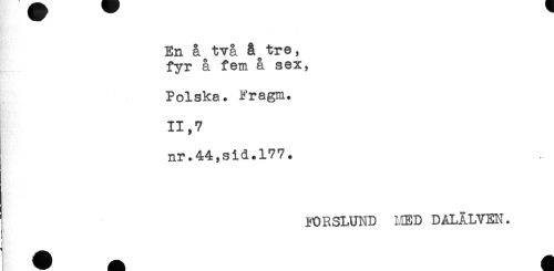 //// En å två & tre, //// fyr å fem å sex, //// Polska. Fragm. //// i'' //// 11,7 //// nr.44,sid.177. //// j FORSLUND HED DALÄLVEN. //// i ////