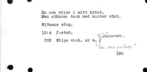//// - ' //// En oro vilar i mitt bröst, //// Men stämmer dock med munter röst, //// - - ** //// Sjömans sång. //// - ' - * //// 12:4 J-stad. , - //// INE Slips visb. nr 4. (f //// ! ^ ^ //// ÅBO //// t //// ' //// t //// i. ////