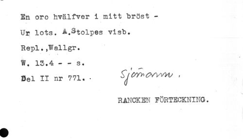 //// En oro hvälfver i mitt bröst - //// Ur lots. ^-.Stolpes visb. //// Repl.,Wallgr. //// W. 13.4--s. //// Sel II nr 771. - , //// RANCKEN FÖRTECKNING. ////