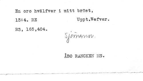 //// En oro hvälfver i mitt bröst, //// 13:4=. RE UpptJTefvar. //// R3, 165,404. //// ÅBO RANCKEN MS. ////