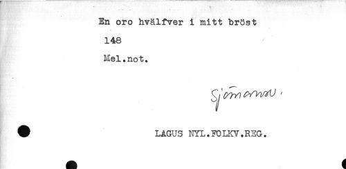 //// En oro hvälfver i mitt bröst //// 148 //// Mel.not. //// * //// 1 //// # LAGUS NYL.FOLKV.REG. //// t' //// - ////
