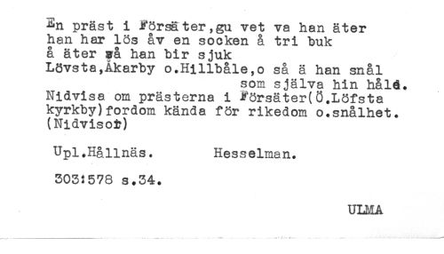 //// ^n präst i försäter,gu vet va han äter //// han har lös åv en socken å tri buk //// å äter gå han bir sjuk //// Lövsta,Åkarby o.Hillbåle,o så ä han snål //// som själva hin håld. //// Nidvisa om prästerna i *orsäter(Ö.Löfsta //// kyrkby)fordom kända för rikedom o.snålhet. //// (Nidvisoir) //// Upl.Hållnäs. Hesselman. //// 303:578 s.34. ////