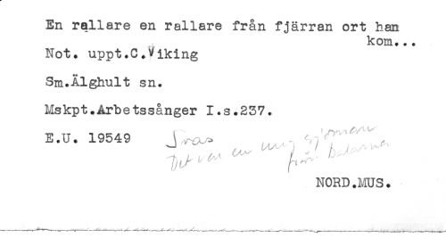 //// En rallare en rallare från fjärran ort han //// kom... //// Not. uppt.C.Viking //// Sm.Ålghult sn. //// Mskpt.Arbetssånger I.s.257. //// E.U. 19549 ' //// NORD.MUS. ////
