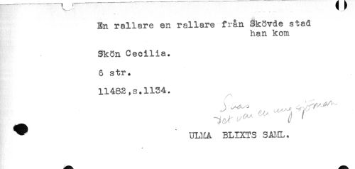 //// En rallare en rallare från Skövde stad //// han kom //// Skön Cecilia. //// 6 str. //// 11482,s.1134. //// ^ ULHA BLIXTS SAML. ////
